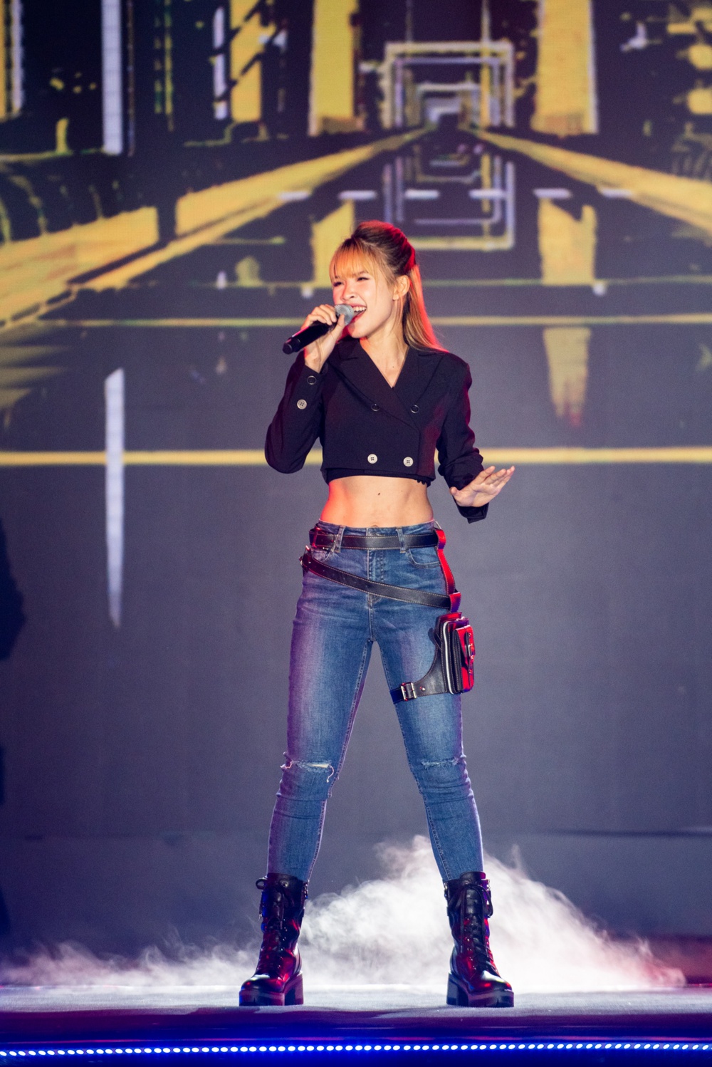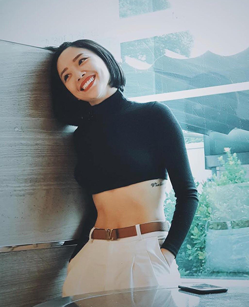 Giọng ca 29 tuổi mặc áo crop top khỏe khoắn, khoe eo thon và bụng nổi rõ múi cơ.
