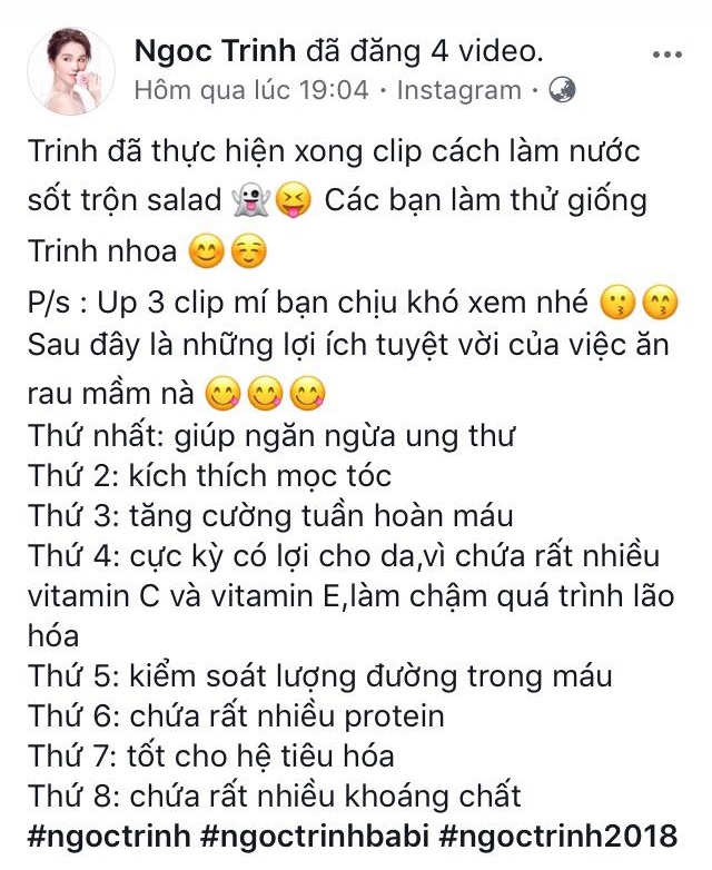 Ngoài ra, Ngọc Trinh còn nêu chi tiết từng công dụng của loại rau thần kì này.