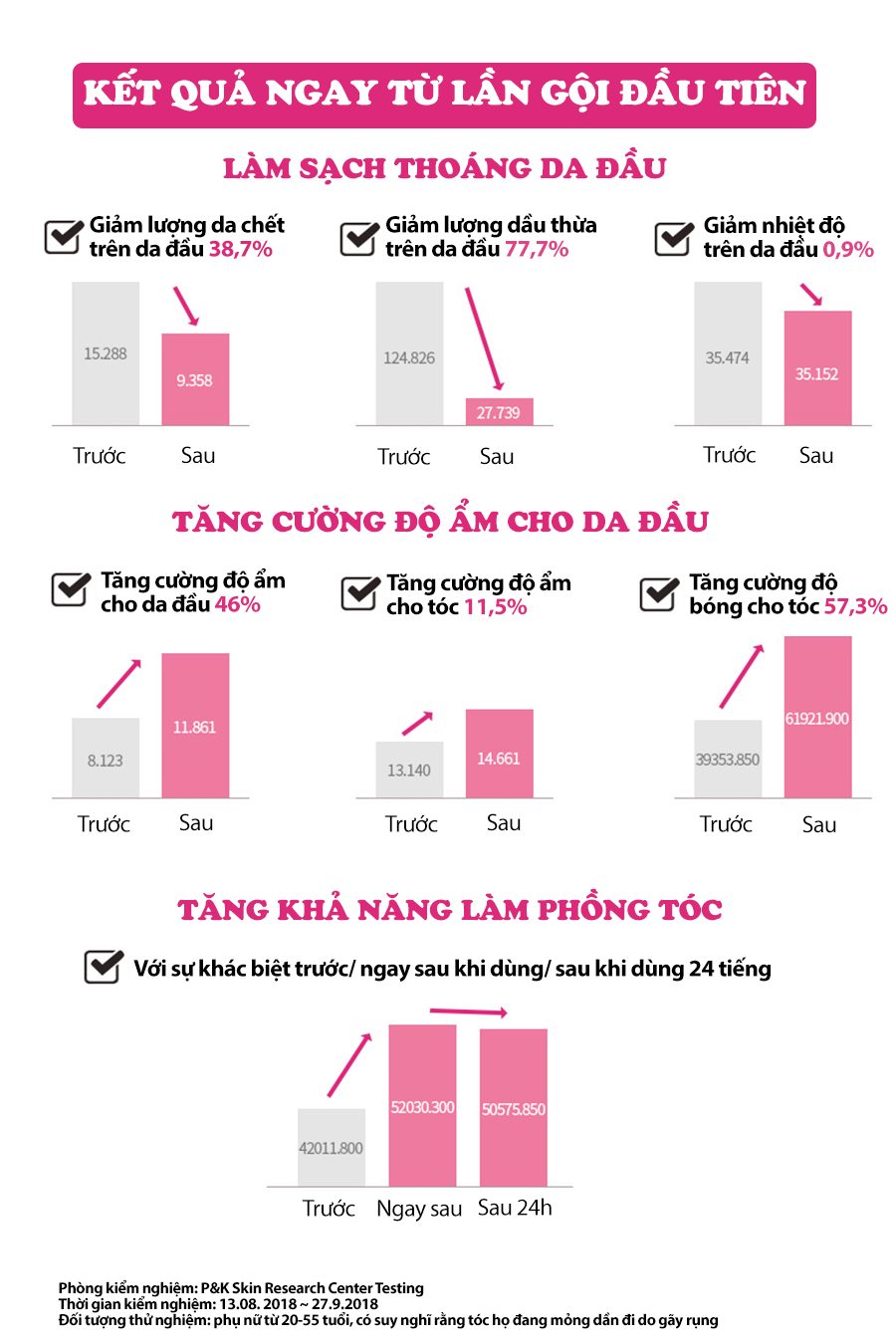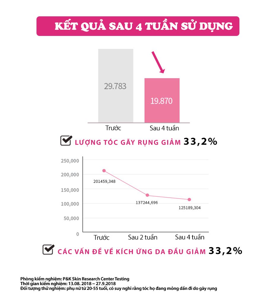 Thử nghiệm cũng chỉ ra, dầu gội muối hồng Himalaya giúp tăng 57,3% độ bóng của tóc, tăng 46% độ ẩm cho da đầu ngay sau khi sử dụng và giảm hẳn 33,2% lượng tóc gãy rụng cũng như kích ứng sau 4 tuần. Đặc biệt khả năng làm phồng tóc và duy trì độ phồng hơn 24 giờ là điều khiến dầu gội muối hồng trở thành vật bất li thân của các chàng trai, cô gái thích sở hữu những mái tóc cá tính.