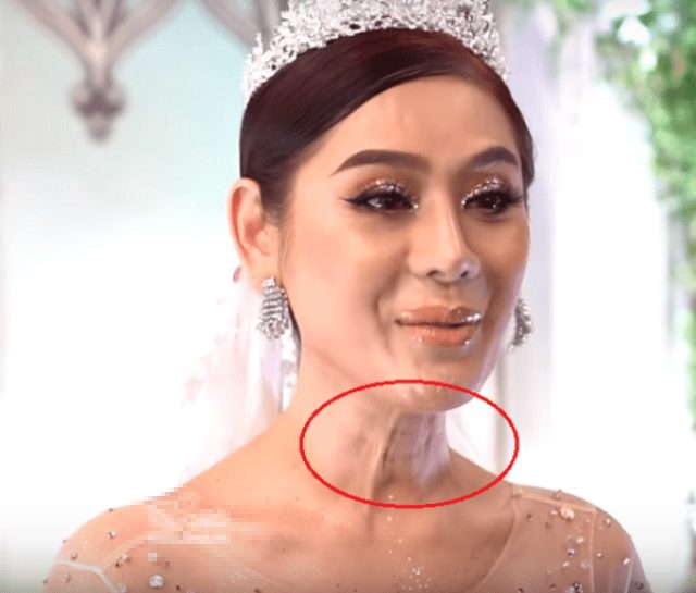 Gương mặt trang điểm tỉ mỉ, nhưng phần da cổ nhăn nheo trông thấy.
