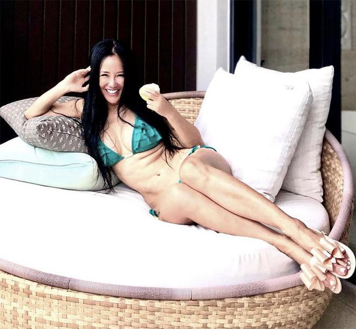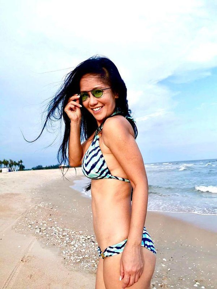 Đặc biệt, MC Kỳ Duyên cũng chăm diện bikini, kiểu áo tắm được MC hải ngoại ưa chuộng thường là những mẫu đơn sắc nhưng có thiết kế cut-out gợi cảm.