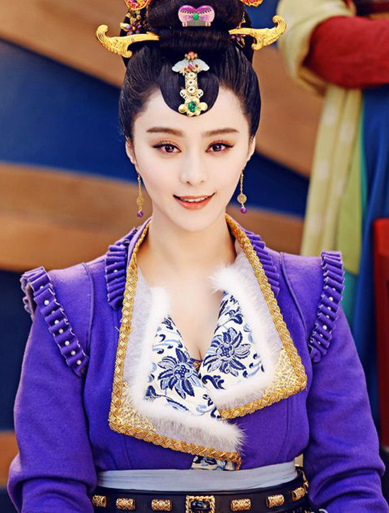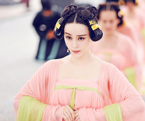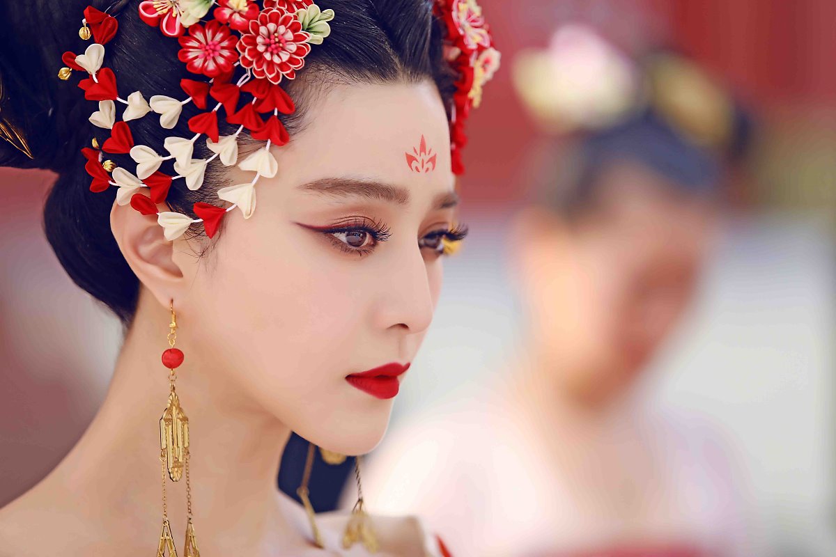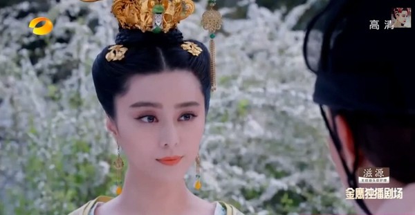 Vẻ đẹp quyền uy của Võ Tắc Thiên được thể hiện thông qua cách makeup mặt trắng, môi đỏ chót, mắt sắc như dao. Tuy nhiên chi tiết gây sốt hơn cả là hình hoa vẽ trên trán, được bám khá sát với lối làm đẹp của phi tần nhà Đường xưa.