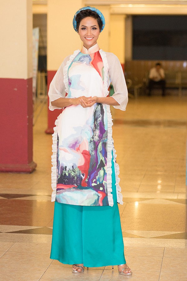 Diện trang phục áo dài, H'Hen Niê chọn son môi hồng nhạt và trang điểm mắt kĩ càng khiến cô nàng có vẻ đẹp dịu dàng, thướt tha hơn.