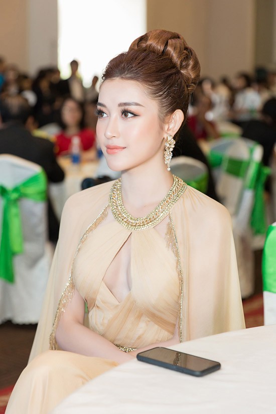 Tại một sự kiện khác, vẫn là son môi màu nhạt quen thuộc, Huyền My nhấn nhá thêm chút màu vàng đồng và nâu vào đôi mắt để match với bộ váy cầu kì mà cô nàng đang diện.