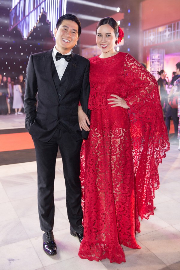 Quả là sau mỗi lần sinh nở, Hương Giang lại nhận được vô khối lời khen về nhan sắc thăng hạng. Bà mẹ hai con đã xuất hiện rạng rỡ bên chồng trong một sự kiện tuần qua. Diện bộ váy ren đỏ NKT Đỗ Mạnh Cường, Lưu Hương Giang trang điểm ton sur ton với màu son đỏ, không quên phụ kiện là hoa cài đầu quyến rũ.