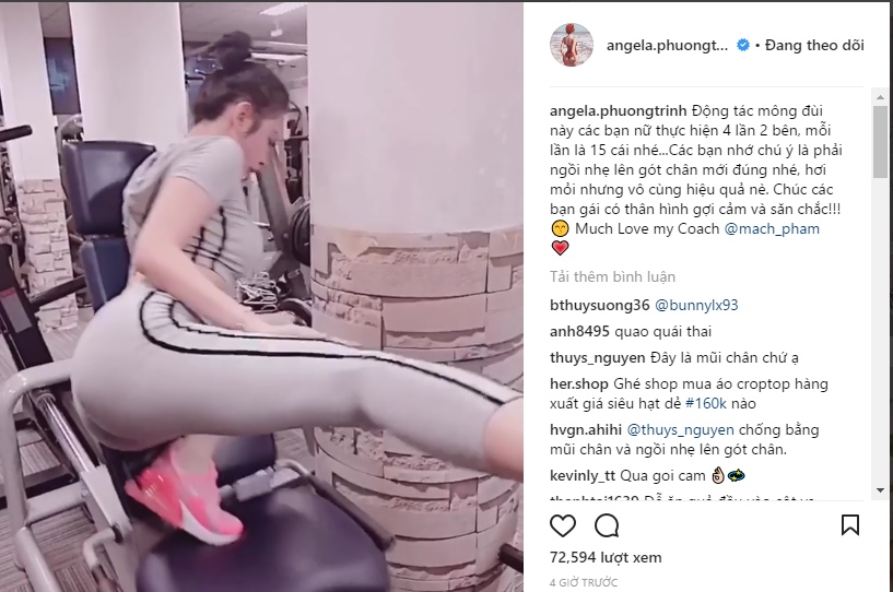 Sau những lần “hướng dẫn” tập luyện khá “sai” bị cộng đồng mạng bốc phốt rầm rộ thì Angela Phương Trinh đã “chịu” tập luyện đàng hoàng. Cô hướng dẫn động tác tập luyện để phát triển cơ mông đùi vô cùng quyến rũ.