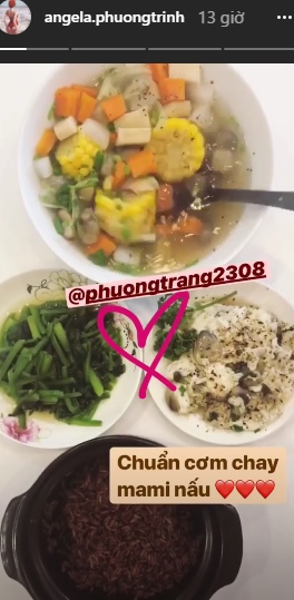 Trinh thường xuyên cập nhật các món ăn chay tự nấu hoặc được chế biến tại nhà hàng. Các món tự nấu đều tốt cho vóc dáng như gạo lứt, rau củ được xào hoặc hấp.