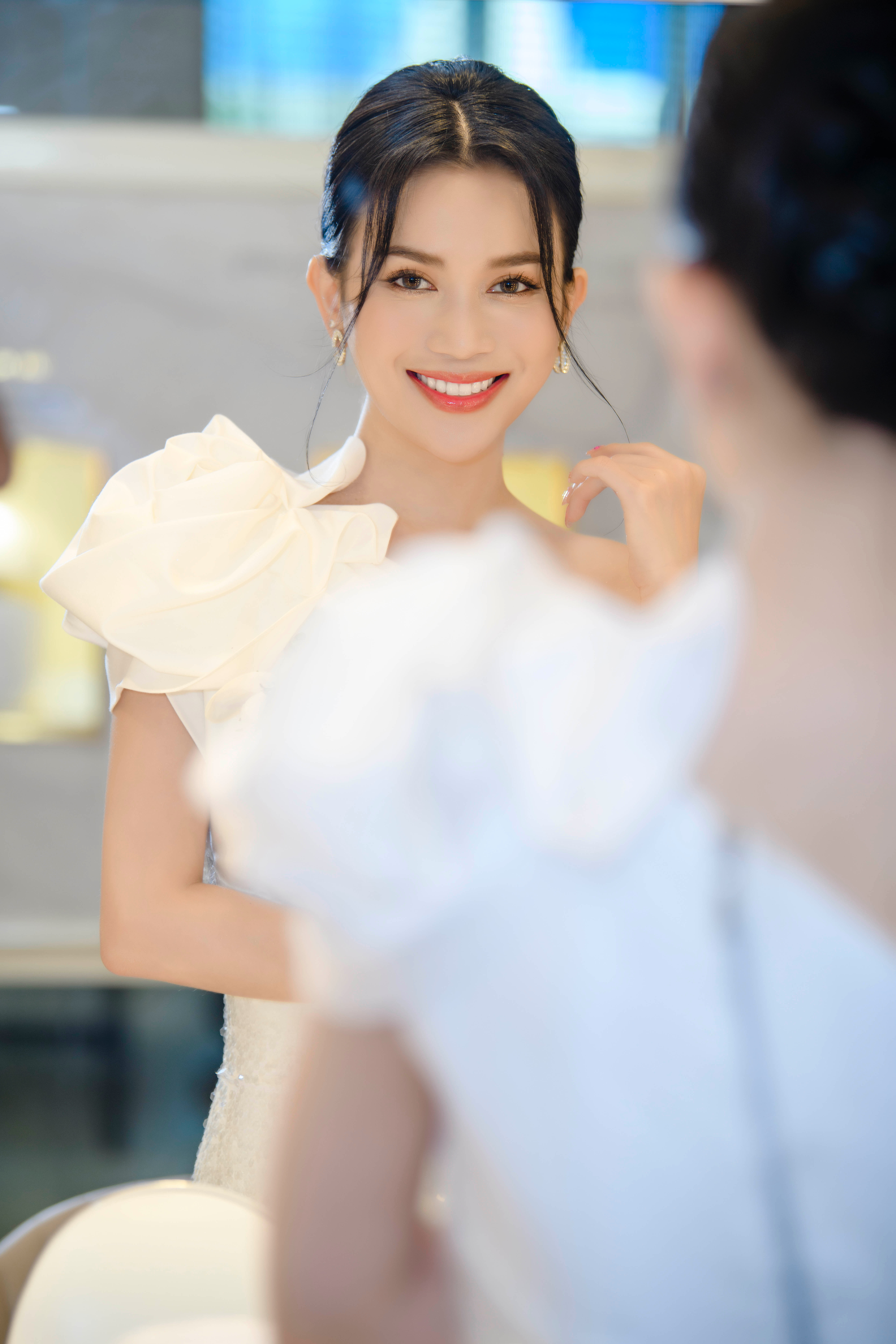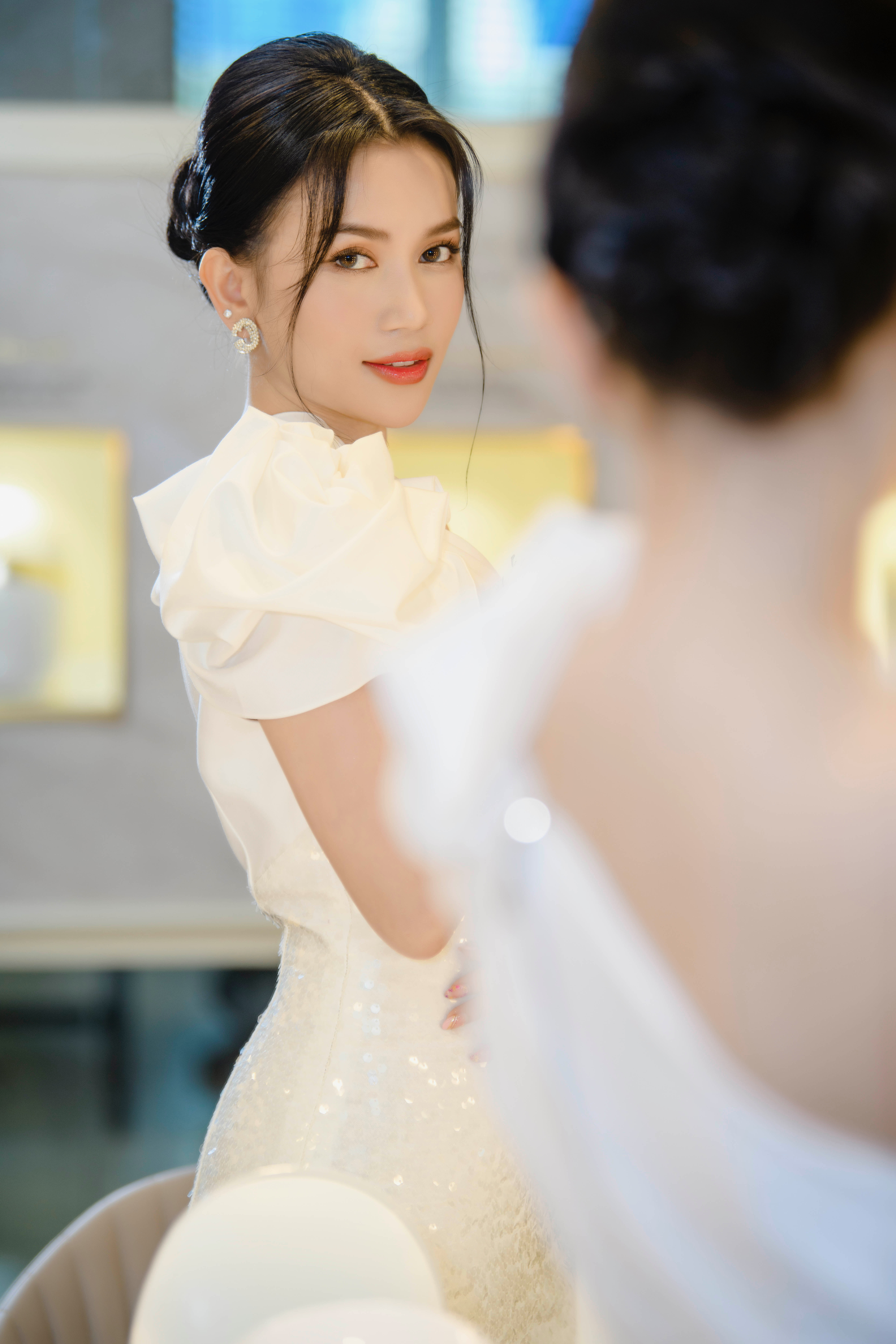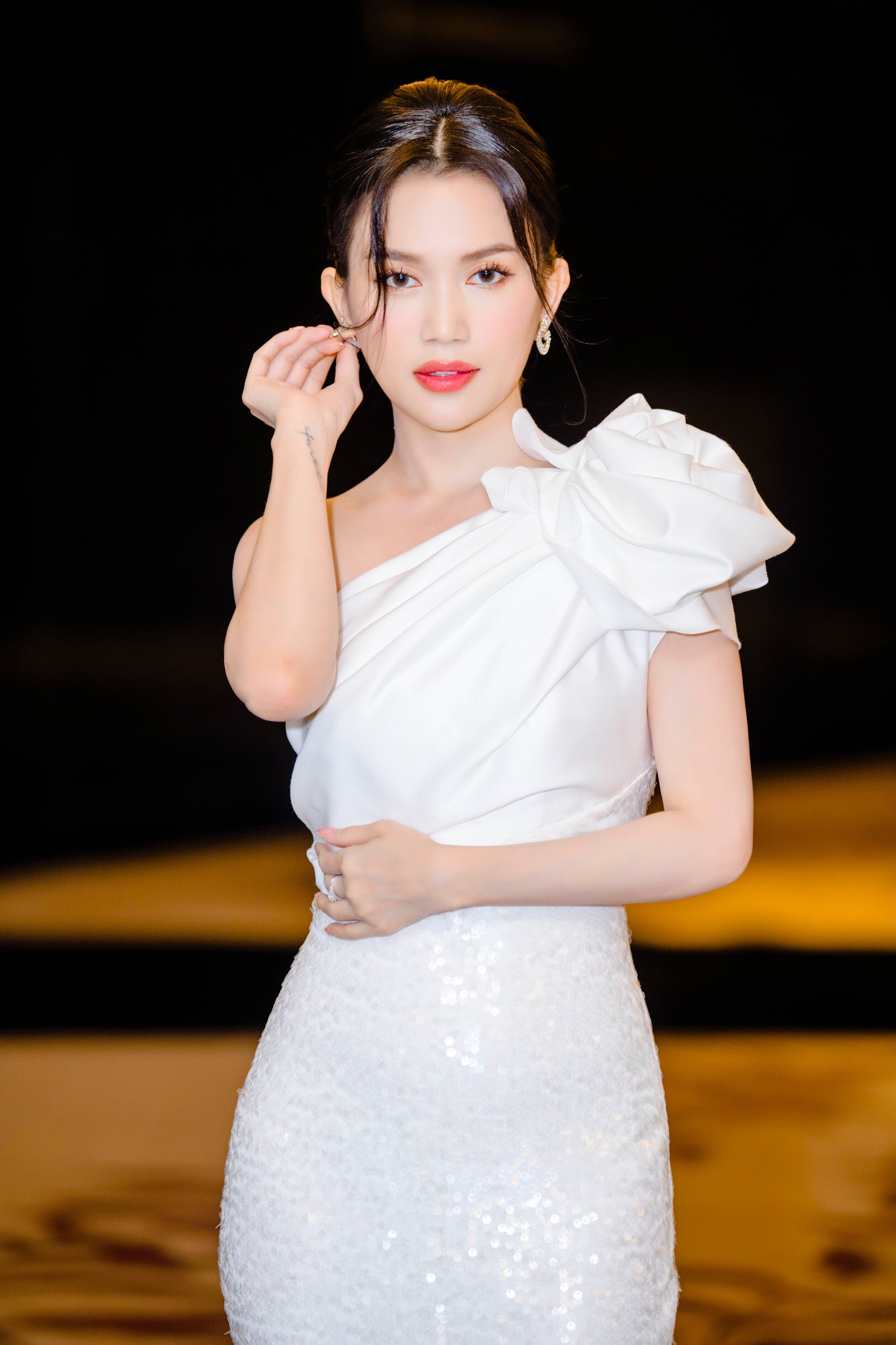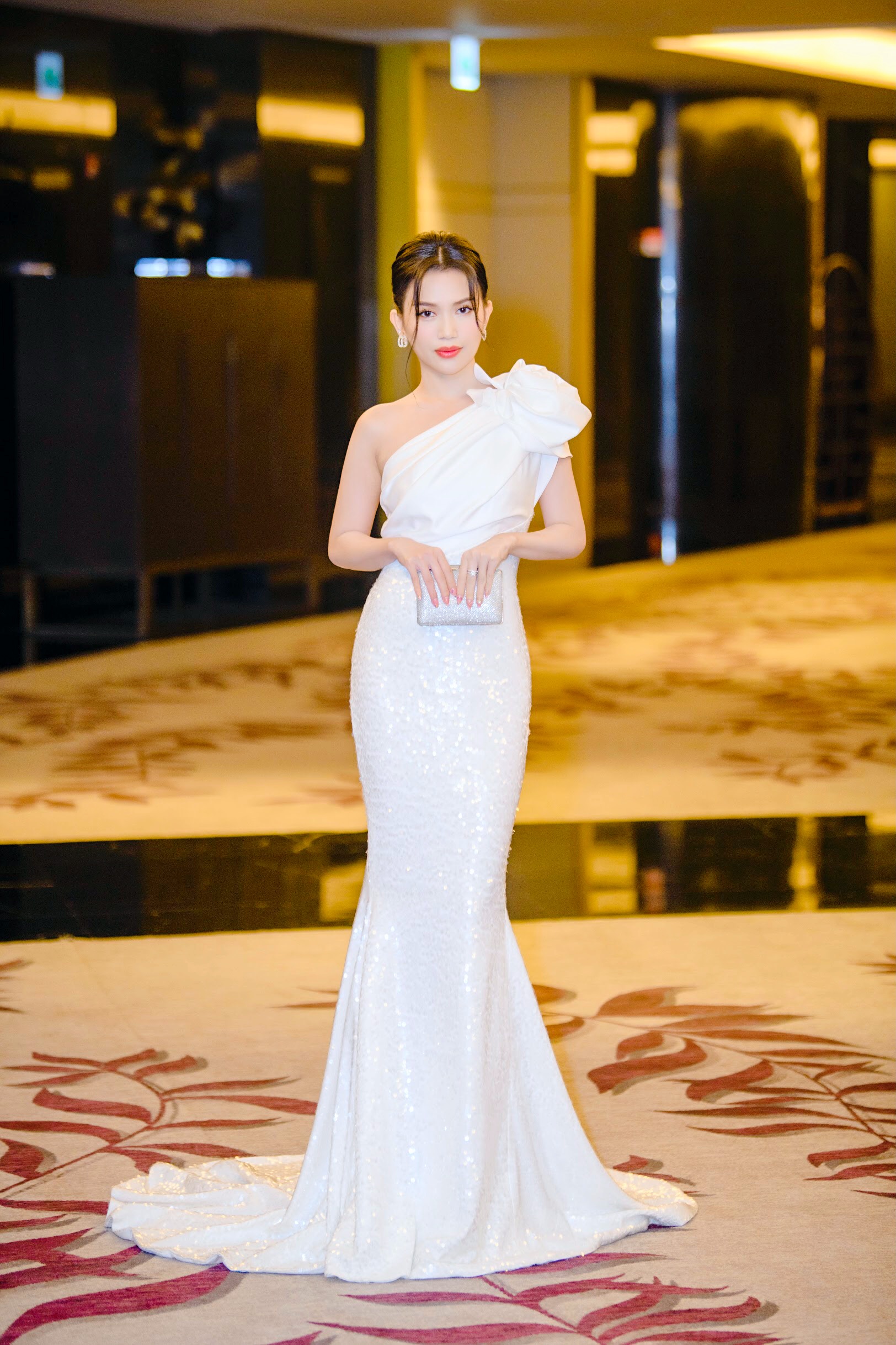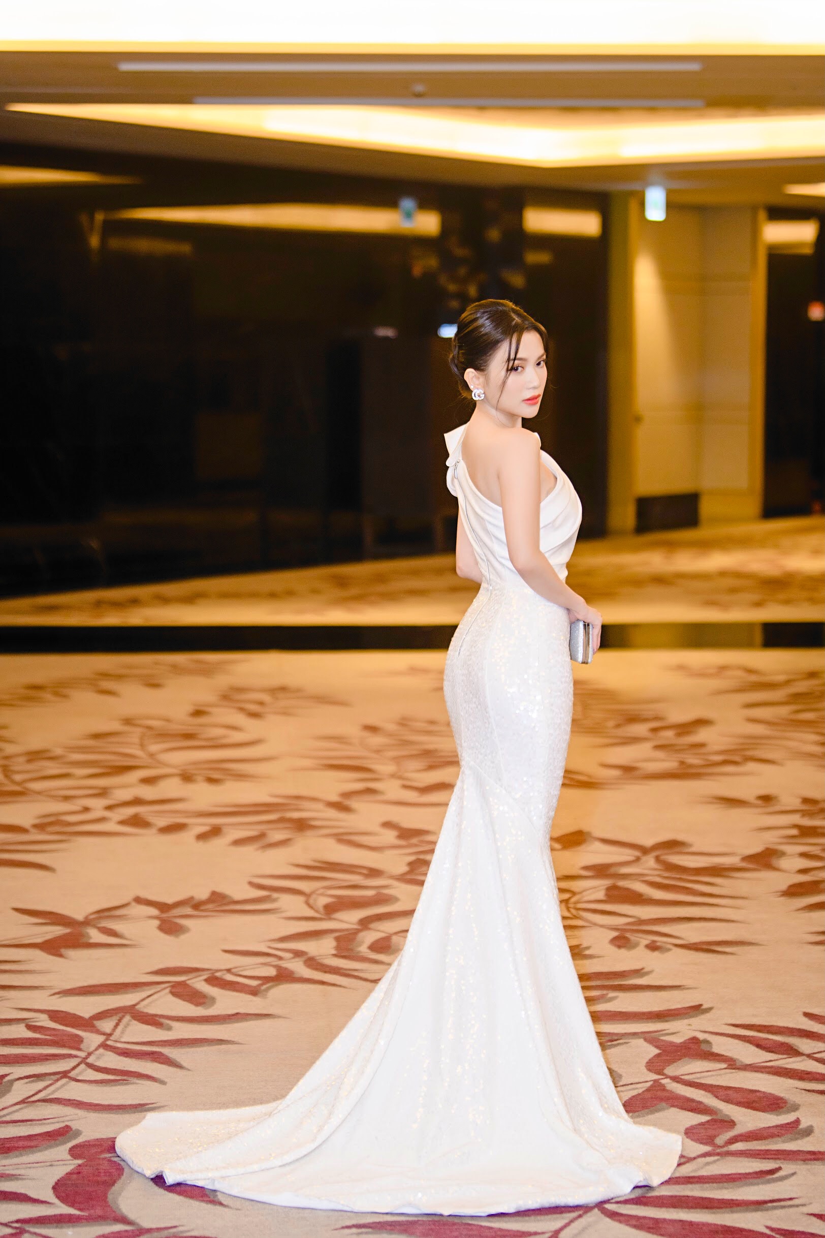 Sĩ Thanh xuất hiện với tư cách khách mời trong bộ đầm dạ hội đuôi cá trắng muốt, tôn đường cong gợi cảm. Mẫu đầm lệch vai ôm khít trắng tinh khôi của Đỗ Long thực hiện riêng, giúp nữ diễn viên tôn lên đường cong nuột nà.