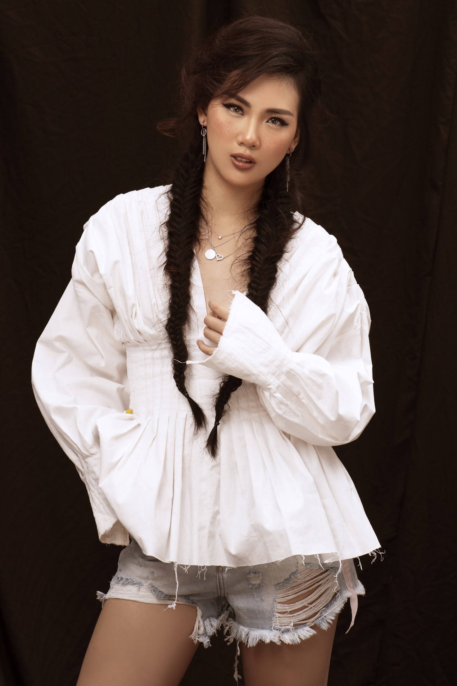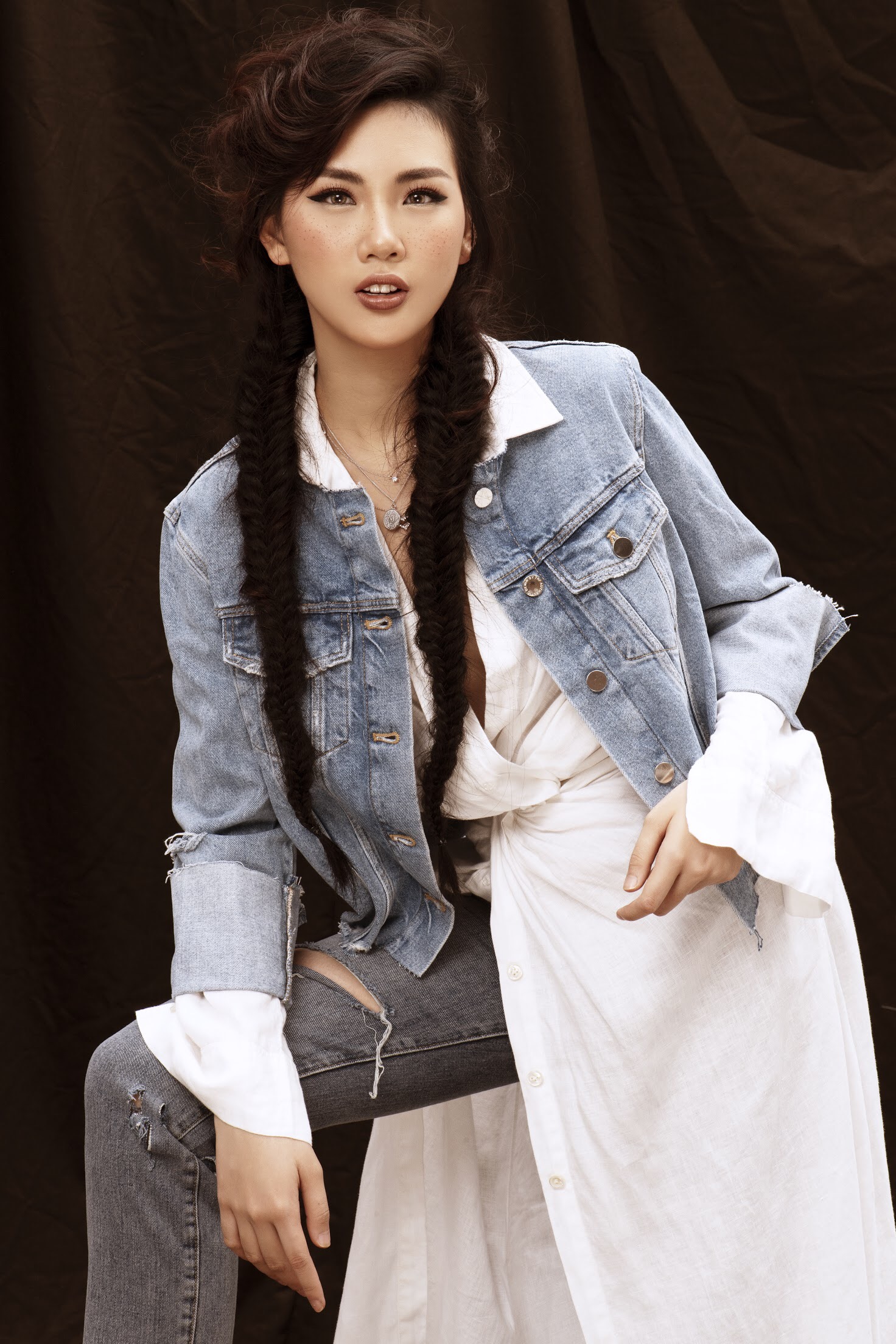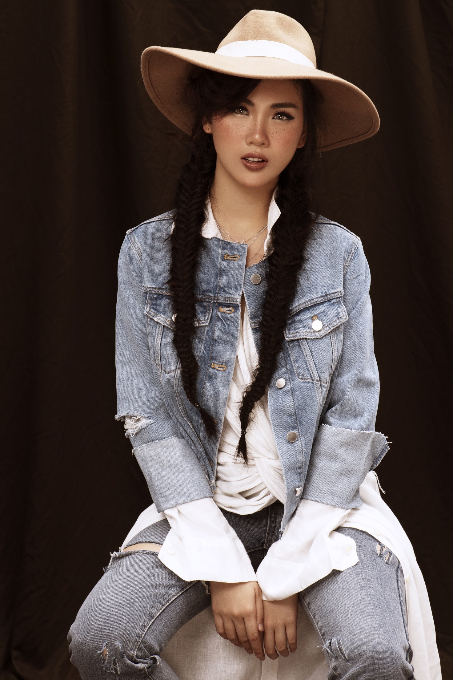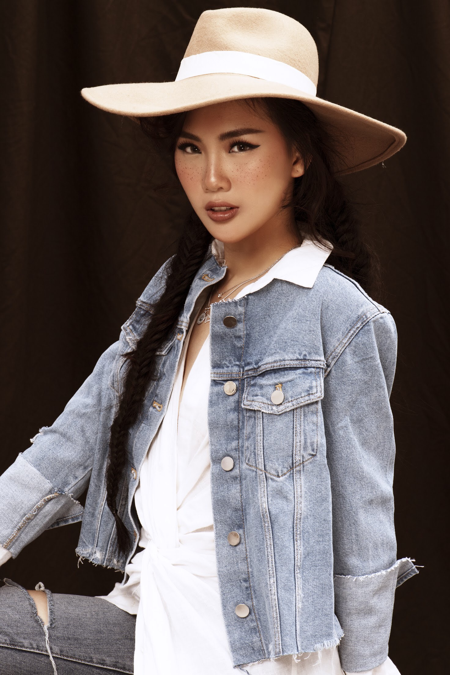 Quỳnh Hoa diện trang phục denim, kết hợp mũ fedora. Phần má được trang điểm tàn nhang, phù hợp với tinh thần bohemian của bộ hình.