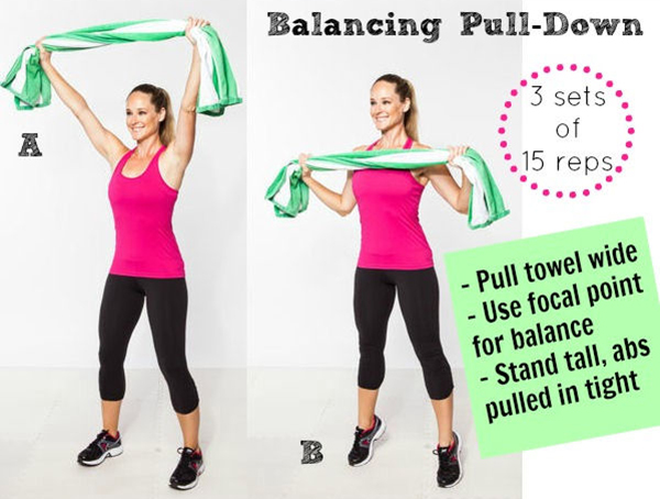 Hai tay giữ hai đầu của một sợi dây không đàn hồi (bạn cũng có thể sử dụng khăn tắm đối với bài tập này) giữ thẳng tay ở trước hông, hai tay dang rộng hơn vai, lòng bàn tay hướng vào nhau như hình A.