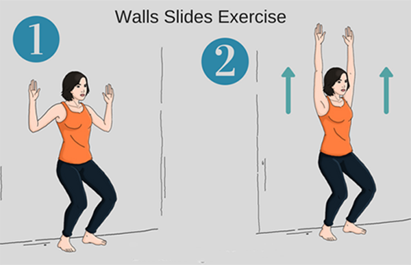 Từ từ thẳng cùi chỏ trượt tay trên tường lên cao như hình B. Dừng 1 vài giây sau đó đi làm theo hướng ngược lại trở về tư thế ban đầu. Kết thúc một hiệp. Lặp lại từ 10-12 lần.