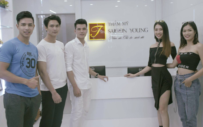 Từ trái qua các thí sinh Trịnh Bảo, Duy Thường, Nguyễn Tuân, Thảo Phương và Mai An có mặt tại thẩm mỹ Saigon Young