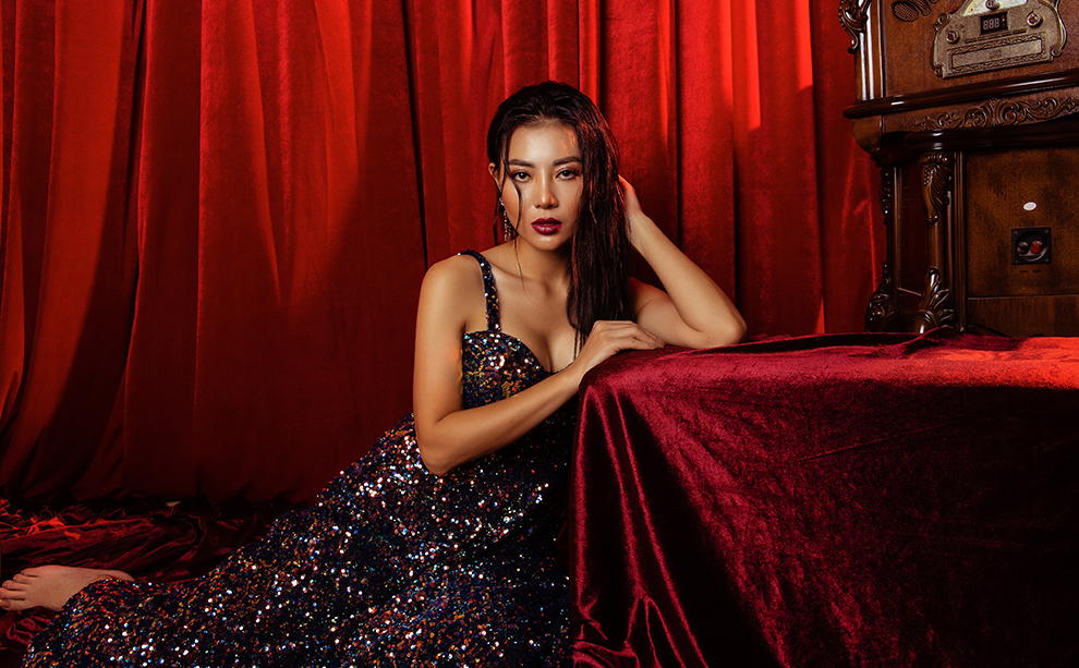 Thanh Hương chọn môi đỏ bầm và mắt đỏ rượu vang cho thêm sang trọng