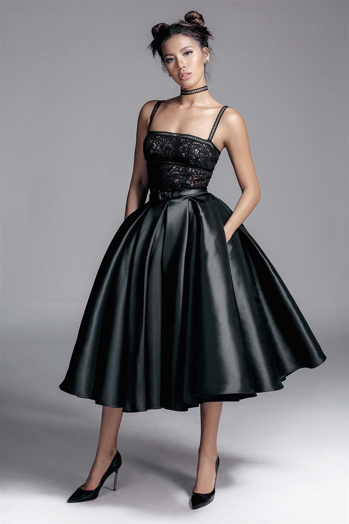 Trước đó Tú cũng chọn kiểu tóc này trong một bộ hình thời trang. Vẻ cá tính của kiểu tóc đối lập với nét sexy quyến rũ của bộ váy tạo nên sự ấn tượng thú vị.