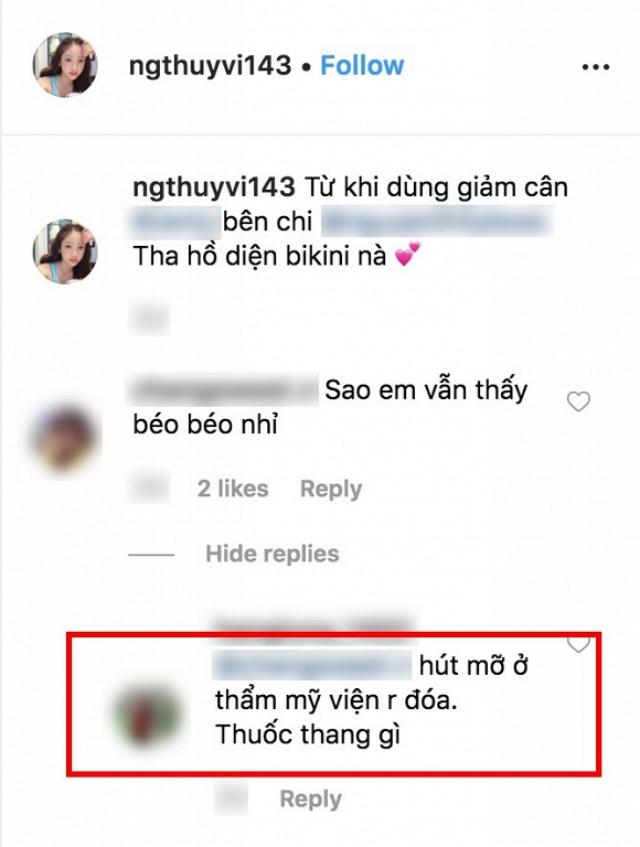 Vào tháng 5 vừa qua, Thuý Vi cũng đã nổi giận đáp trả dư luận khi bị chê tăng cân quá đà. Cụ thể, khi đăng tải bức ảnh khoe dáng trong bộ đầm màu xanh pastel, Thuý Vi để lộ thân hình tròn trĩnh, khuôn mặt đầy đặn và lập tức bị chê béo.