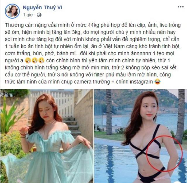 Liền sau đó, cô nàng đăng thêm tấm ảnh khoe dáng trong set đồ bikini nhưng bị nói là sản phẩm của photoshop. Tức nước vỡ bờ, Thuý Vi đăng tải đoạn status giải thích rằng đôi khi không thể kiềm lòng trước sự hấp dẫn của đồ ăn nên có thả lỏng bản thân một chút.