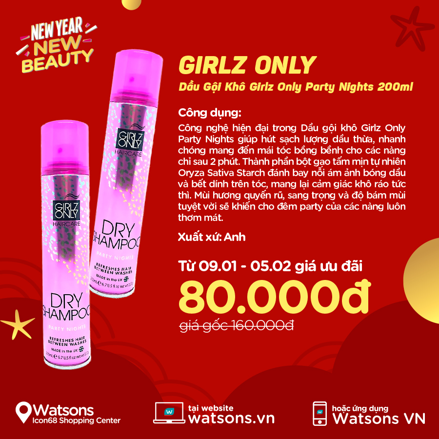 Dầu gội khô Girlz Only Party Nights - vị cứu tinh của những mái tóc bết dầu hay những thời điểm quá bận rộn, cần 1 giải pháp nhanh, tiện lợi. Mái tóc ngay lập tức được sạch sẽ, bồng bềnh trở lại như vừa được gối sấy trong salon, giúp bạn lấy lại vẻ tự tin hay kịp thời tỏa sáng tại các buổi tiệc tùng. “Bảo bối” nhỏ gọn, tiện lợi dễ dàng mang theo.