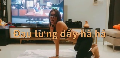 Minh Tú thực hiện động tác plank mà Angela Phương Trinh vừa 'hướng dẫn' để có một vòng eo hoàn hảo. Cô không quên chú thích thêm lí do sai ở đâu “Đau lưng đấy há há'.