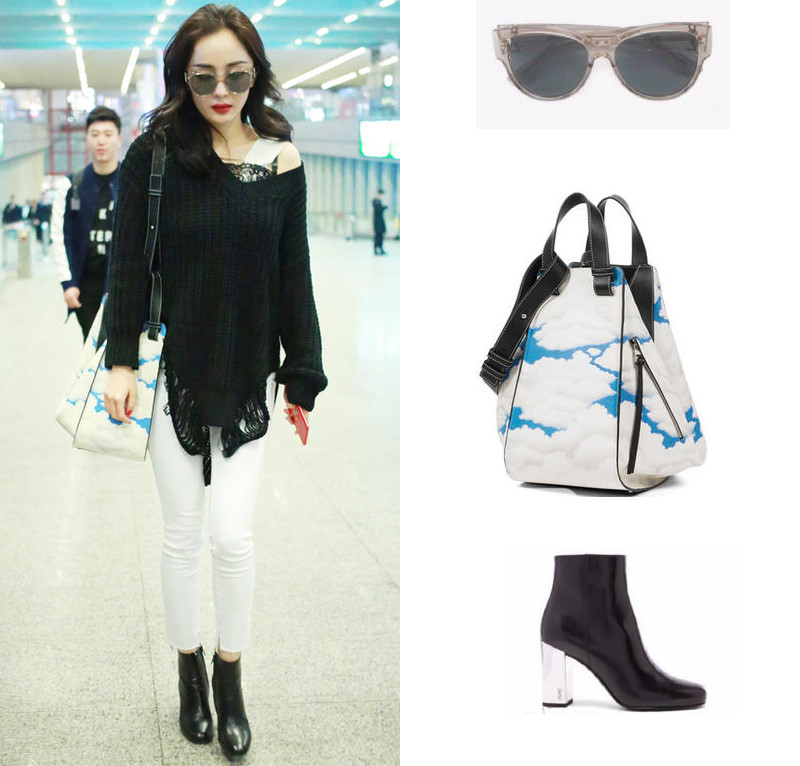 Dương Mịch còn cực kì sành điệu với kính mắt và boots đế trong Saint Laurent cùng túi xách của Loewe.