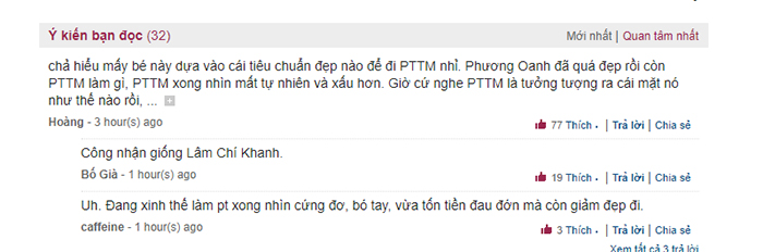 Nhận xét về nhan sắc mới của Quỳnh búp bê, bạn Hoàng chia sẻ: ” Phương Oanh đã quá đẹp rồi còn phẫu thuật thẩm mỹ làm gì. Phẫu thuật thẩm mỹ xong nhìn mất tự nhiên và xấu hơn.” ; một độc giả khác bình luận: ” Công nhận giống Lâm Chí Khanh”