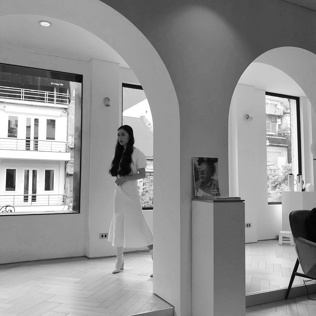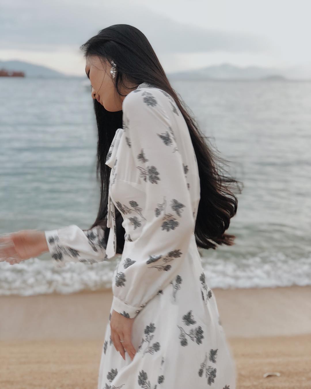 Dịu dàng, mong manh như một nữa thần với đầm voan trắng cùng mái tóc đen bồng bềnh.
