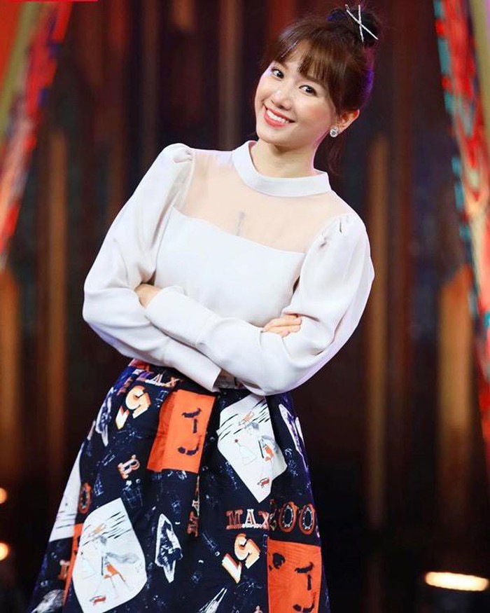 Cũng là tóc mái ngang nhưng Hari Won quyết búi cao phía sau để trông gọn gàng.