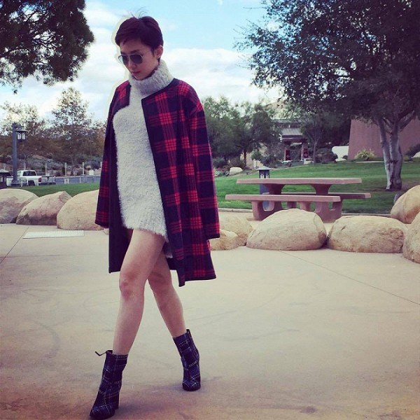 Boots họa tiết kẻ caro dành cho tín đồ thời trang yêu thích sự mới lạ. Đi cùng là áo khoác họa tiết caro đỏ - đen tạo nên style mang hơi hướng Tây âu. Muốn sexy như Tóc Tiên hãy học hỏi mốt giấu quần từ cô ấy.
