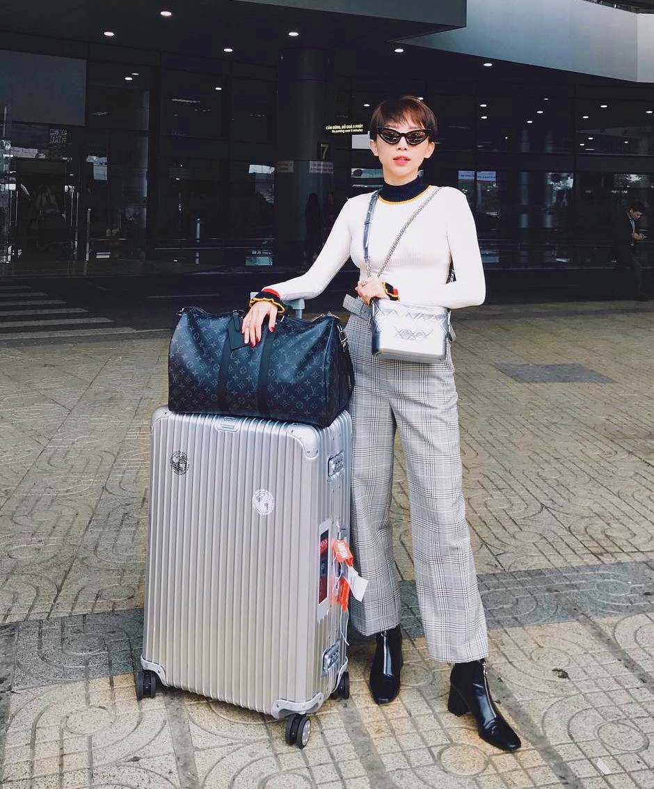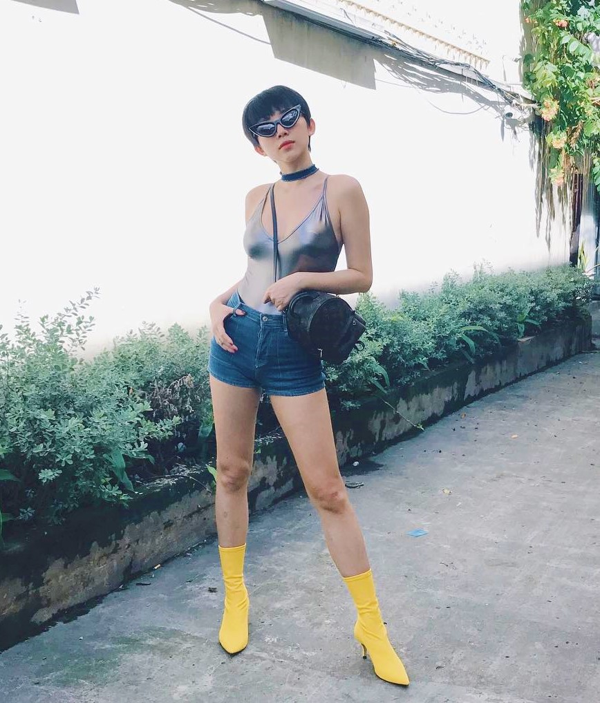 Boots da là một items cơ bản trong tủ đồ. Nó có thể phối cùng nhiều trang phục khác nhau. Trong ảnh, Tóc Tiên phối áo body cùng quần kaki kẻ sọc và boots da đen làm điểm nhấn chính cho tổng thể.