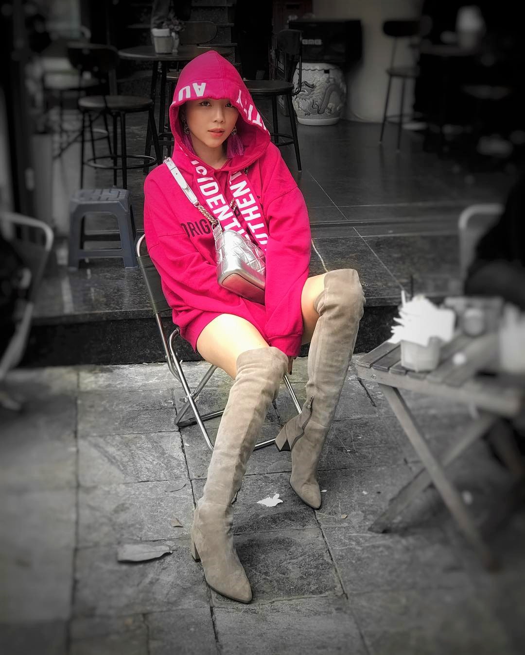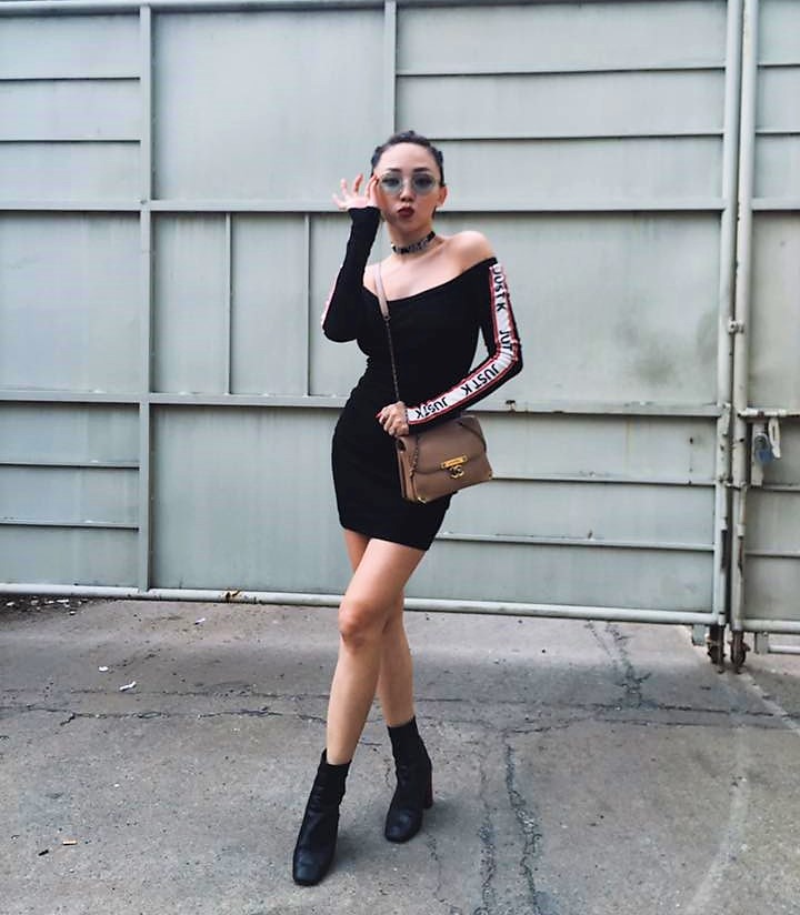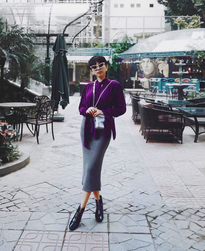 Để chiếc áo tím không trở nên sến sẩm như thường thấy, Tóc Tiên khéo léo phối cùng chân váy màu xám khá lạ mắt. Đôi boots da màu đen trong trường hợp này tạo độ “ngầu” nhất định cho một cô nàng mặc váy.