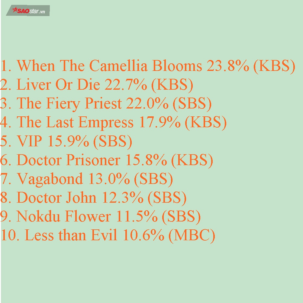 Năm qua cũng có 3 phim vượt qua mốc rating quan trọng 20% là When The Camellia Blooms (23.8%), Liver Or Die (22.7%) và The Fiery Priest (22.0%). Các phim còn lại trong top 10 đều vượt qua rating 10%.