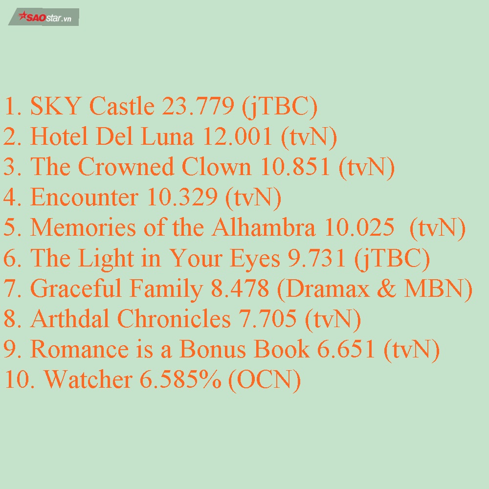 Các phim còn lại trong top 10 đều vượt qua cột mốc rating 5% và đều lọt vô top 50 phim có rating cao nhất trong lịch sử đài cáp. Phim Hotel Del Luna (12.001%) đứng vị trí thứ 8, The Crowned Clown (10.851%) đứng vị trí thứ 11, Encounter (10.329%) đứng vị trí thứ 13, Memories of the Alhambra (10.025%) đứng vị trí thứ 14, The Light in Your Eyes (9.731%) đứng vị trí thứ 16, Graceful Family (8.478 %) đứng vị trí thứ 20, Arthdal Chronicles (7.705%) đứng vị trí thứ 26, Romance Is a Bonus Book (6.651%) đứng vị trí thứ 36 và cuối cùng là Watcher (6.585%) đứng vị trí thứ 38.