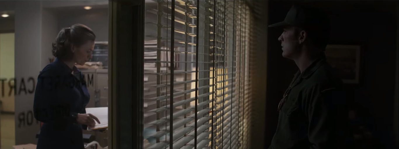 Trong khi kế hoạch du hành thời gian đang diễn ra, Iron Man và Ant Man bỗng dưng hết hạt Pym cần thiết để thực hiện thêm hai lượt đi cuối cùng. Vì thế, Tony và Steve đã quay trở về New Jersey năm 1970, đến trụ sở S.H.I.E.L.D. để lấy thêm hạt Pym và Viên đá Không gian. Ở đó, Tony đã gặp lại bố anh, còn Steve đã lẩn vào trong một gian phòng, tại đó anh đã nhìn thấy Peggy thông qua lớp kính, gặp lại người mình luôn thương nhớ gần ngay trước mắt nhưng xa tận chân trời.