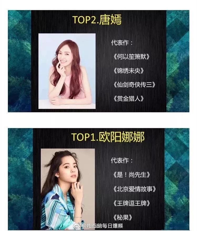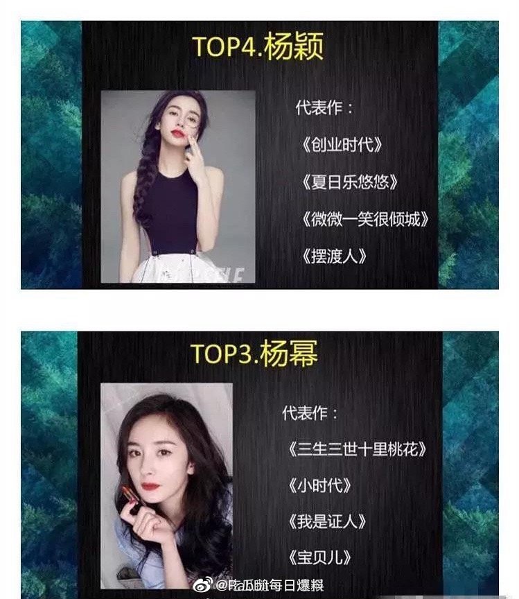 Nhưng với một người không có mấy kinh nghiệm diễn xuất như Angelababy thì đa số đóng phim nào là flop phim đó, điểm Douban thấp thảm thương, khả năng diễn xuất vấp phải chỉ trích, chê bai thậm tệ, đặc biệt là lối diễn trừng mắt. Angelababy xếp vị trí thứ 4 trong bảng xếp hạng lần này. Nối gót theo Angelababy là ông xã Huỳnh Hiểu Minh cũng góp một suất với vị trí thứ 5.