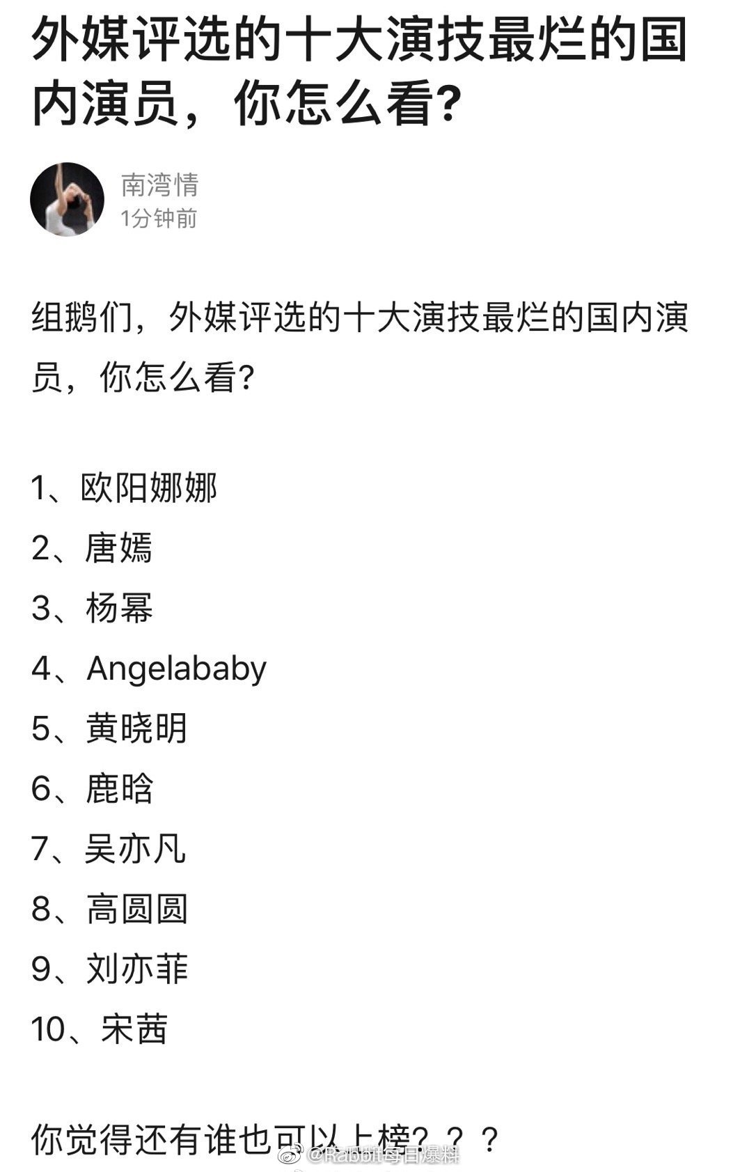 10 minh tinh Hoa ngữ có khả năng diễn xuất tệ nhất do truyền thông nước ngoài bình chọn: