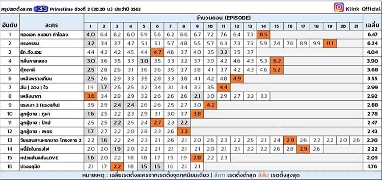 Theo đó, tính đến nay bộ phim truyền hình Krong Karm - Lồng nghiệp chướng vẫn giữ được ngôi vương với xếp hạng rating cho tập cuối lên đến 2 con số. Bộ phim vừa mới kết thúc Kin Kasalong - Hương hoa đạt phước dù nhận được phản hồi rất tích cực của khán giả, từng lọt top trend world wide trên twitter nhưng vẫn không thể vượt qua ngôi vương mà Bella và James Jirayu nắm giữ. Đừng quên nửa cuối năm 2019 đài 3 vẫn còn rất nhiều thực đơn phim truyền hình hấp dẫn khác gửi tới khán giả mê phim Thái, nhớ đón xem nhé!