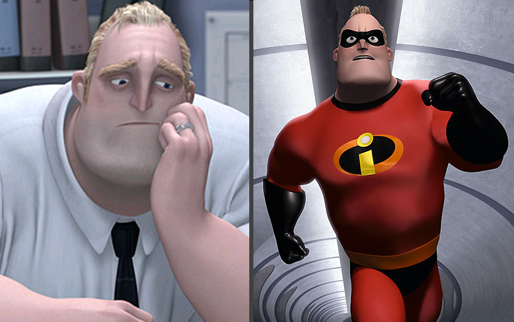 Khi The Incredibles phần đầu tiên được ra mắt, chúng ta có thể nhìn vào thế giới như thường ngày. Siêu anh hùng tồn tại như một phần bình thường của xã hội và chỉ hành động khi cần thiết với khả năng tốt nhất của mình. Họ được mọi người chào đón, sẵn sàng giúp đỡ mọi người khi có thể, từ ngăn chặn những tên cướp đến cứu chú mèo trên cành cây. Cách khiến các nhân vật có siêu năng lực không được làm rõ ràng trong phim, vì vậy không phải ai cũng có chúng, nhưng có sức mạnh không phải là điều bất thường. Chúng tôi gặp Mr.Incredible và Elastigirl siêu mạnh ở trong phim cùng những đứa con của họ