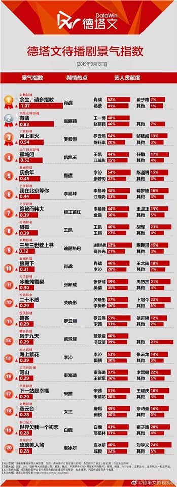Nhìn vào danh sách trên sẽ không bất ngờ khi hai bộ phim đứng hai vị trí cao nhất là hai tác phẩm của hai mỹ nam “lưu lượng” đình đám của Trần Tình Lệnh là Tiêu Chiến và Vương Nhất Bác, chưa kể bạn diễn đóng cặp của họ cũng là hai hoa đán hàng đầu: Dương Tử và Triệu Lệ Dĩnh.