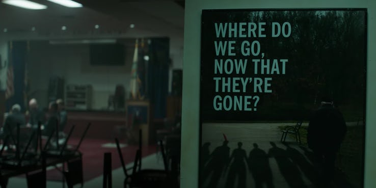 Những người sống sót còn lại đang cố gắng hiểu những gì đã xảy ra và có ít nhất một trong những người đó đã thành lập một nhóm hỗ trợ. Đây là một loại cộng đồng khá quen thuộc với việc đưa những người tham gia ngồi trong một vòng tròn và nói chuyện để giải quyết nỗi đau và nỗi sợ hãi của họ.