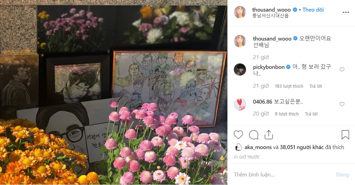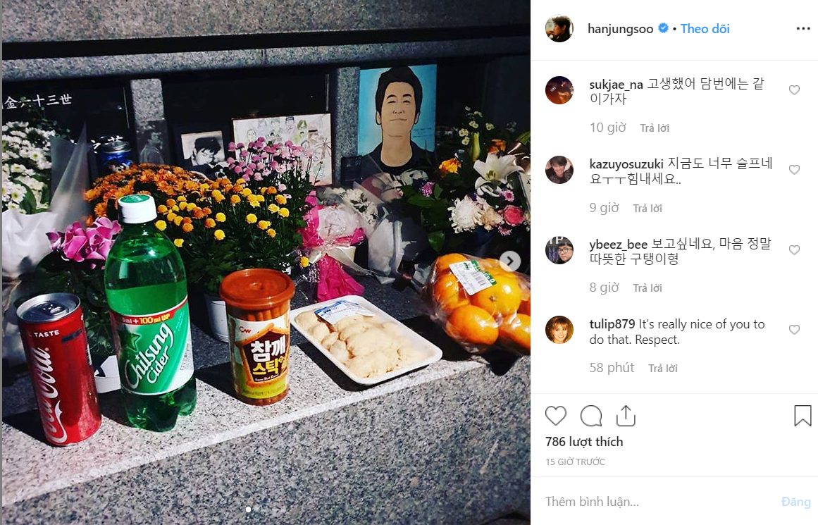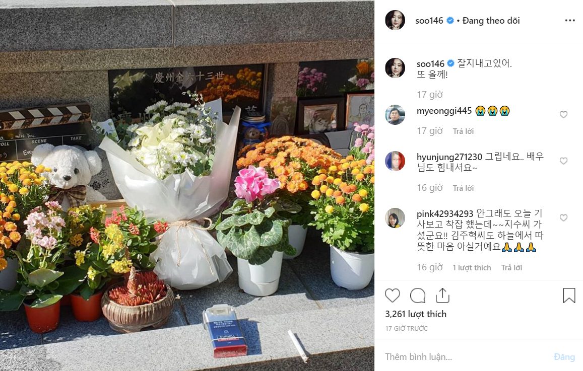 Han Jung Soo đến viếng mộ người bạn thân nhất của mình vào buổi tối với lời chia sẻ: “Em đi trễ và khi em đến thì trời đã khuya rồi. Em đến cùng quản lý Ki Young của anh đấy, cậu ấy nhập cư đến Mỹ rồi anh ạ. Cảm ơn tất cả mọi người, những bạn bè đồng nghiệp đã đến viếng thăm anh vào hôm nay#Kim Joo Hyuk #Em nhớ anh”.