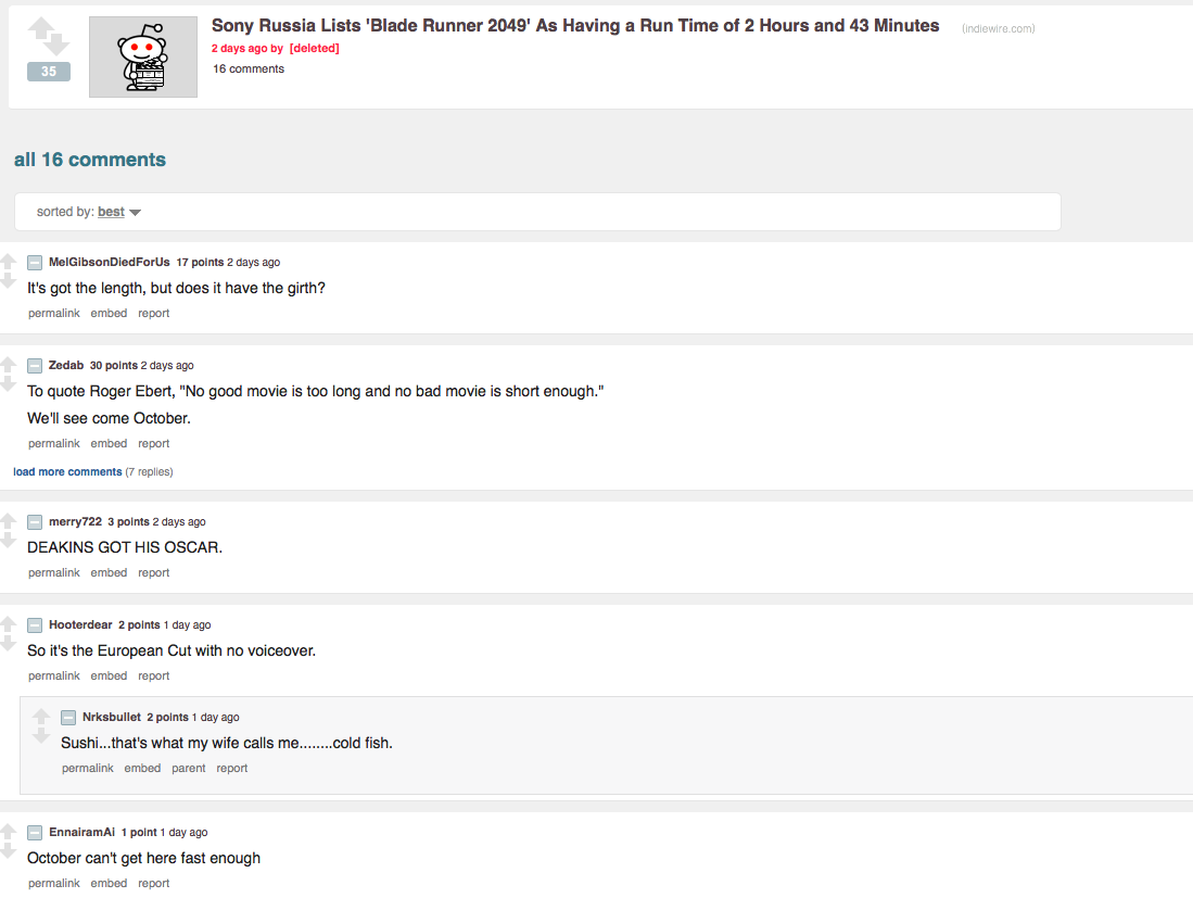 Nguồn tin này đến từ một forum internet ngẫu nhiên, bởi một người dùng Twitter tên Anton Volkov. Tin đó chưa hẳn là quá chắc chắn, nhưng dựa trên thông tin anh ta chia sẻ trên Twitter, dường như Blade Runner 2049 sẽ dài như vậy đấy. Vậy thì sẽ có nhiều pha hành động gây cấn để thưởng thức và có nghĩa là bạn sẽ phải lên kế hoạch đi vệ sinh giữa giờ một cách kĩ càng cho bộ phim này đấy vì chắc rằng bạn sẽ không muốn bỏ lỡ chi tiết nào đâu - thật sự hy vọng thế. Điều này khiến cho nó sẽ trở thành bộ phim bom tấn dài nhất được ra mắt vào 2017.