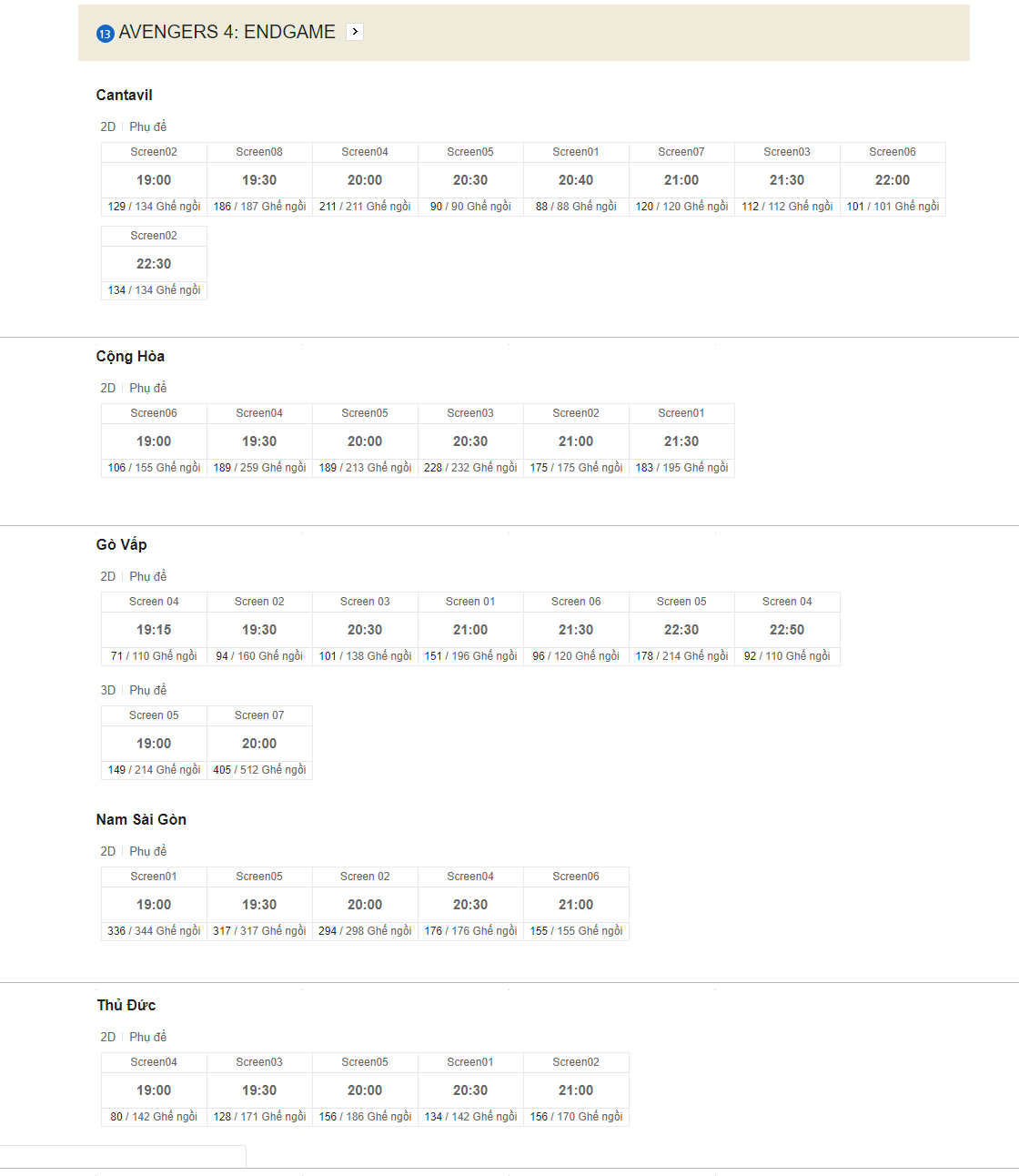 Chính vì thế, lượng vé tại đây khan hiếm hơn hết. Chỉ sau 2 tiếng, gần như mọi chỗ ngồi đẹp nhất đều đã được bán hết. Thậm chí một số suất chiếu có lấp đầy cả những hàng A, và như bạn đã biết, nếu xem phim bản IMAX mà ngồi ở 4 hàng đầu thì chính là hành hạ cái cổ của mình. Thế nhưng, vì để là người đầu tiên xem Avengers: Endgame, nhiều người bất chấp tất cả để có được chiếc vé quý báu.