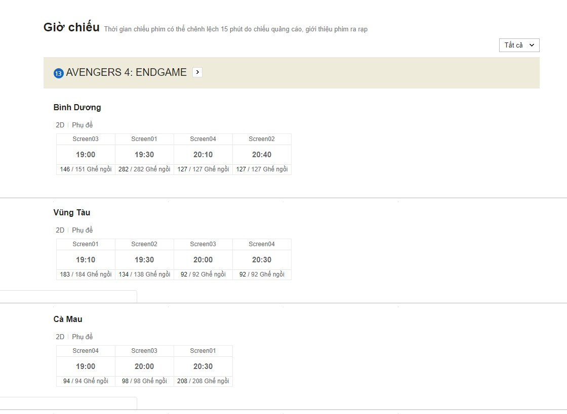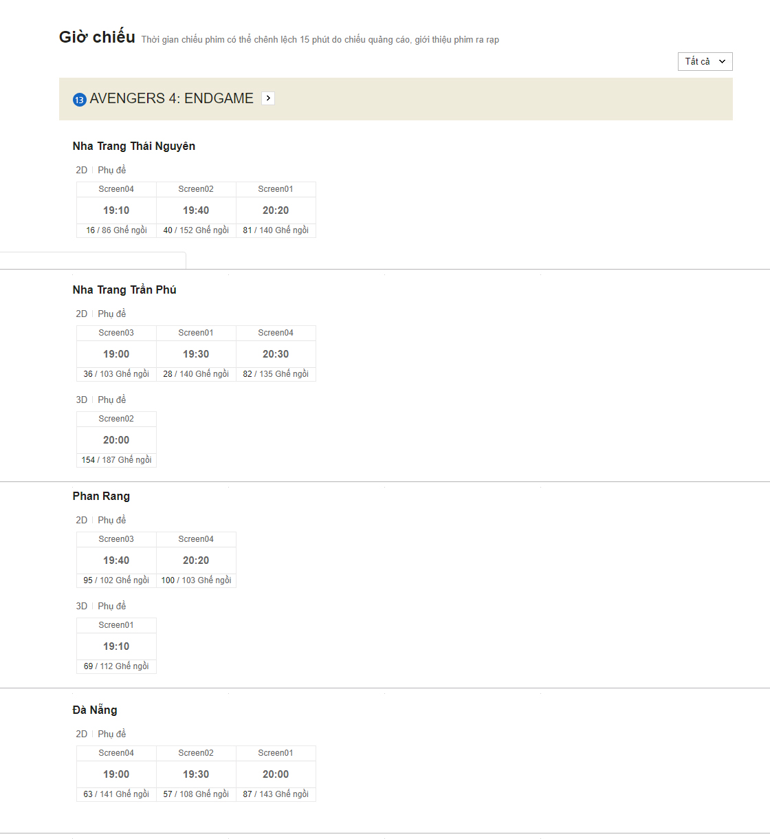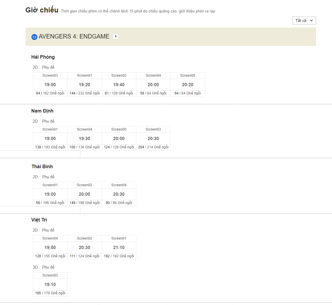 Vào lúc 19h ngày 18/04/2019, các hệ thống rạp phim ở Việt Nam đã chính thức mở bán vé. Mỗi rạp sẽ có những chính sách riêng cho việc mua vé trực tiếp tại rạp, đặt vé thanh toán online cũng như số lượng suất chiếu.