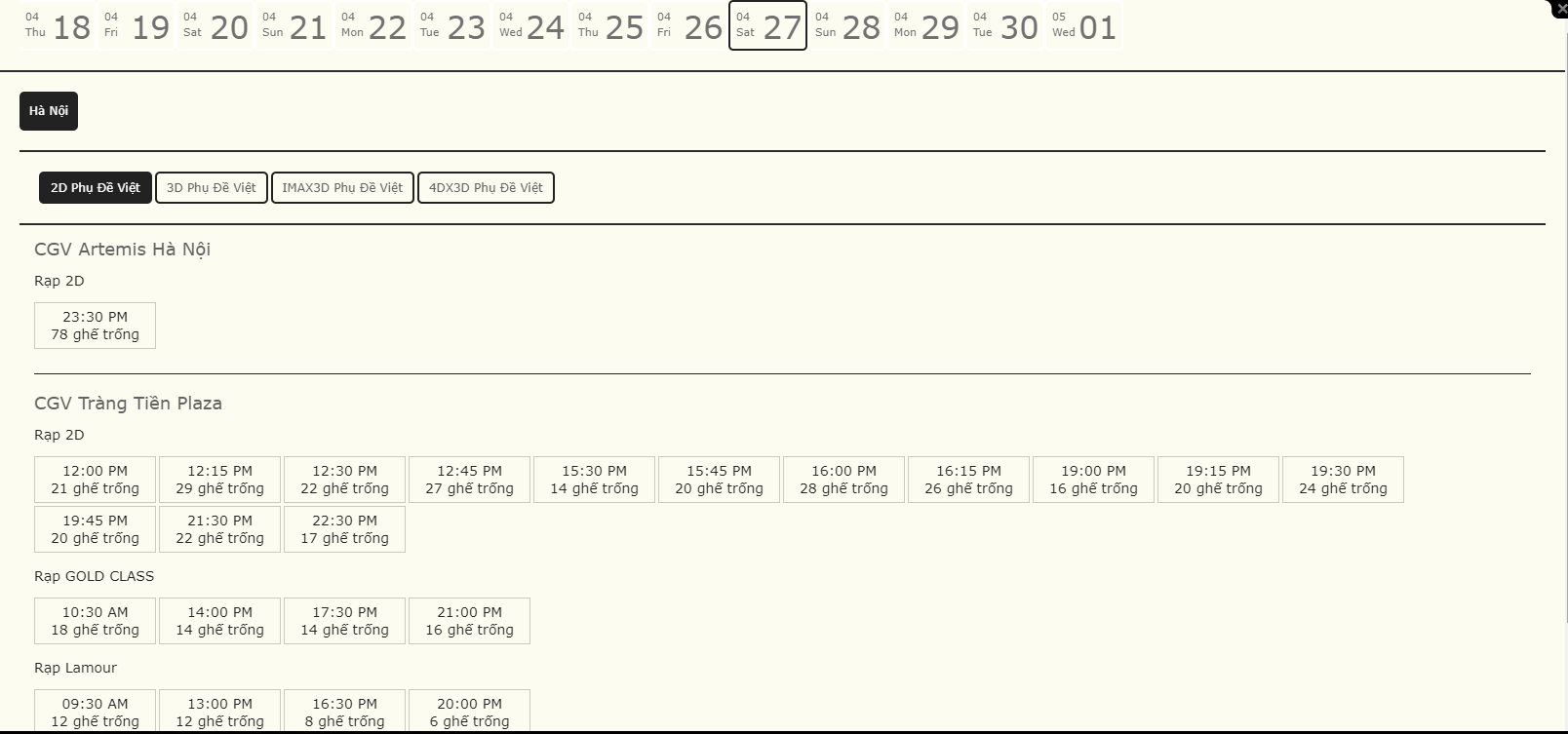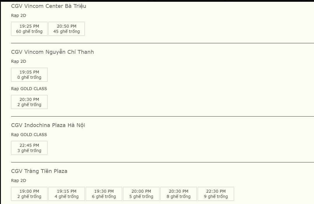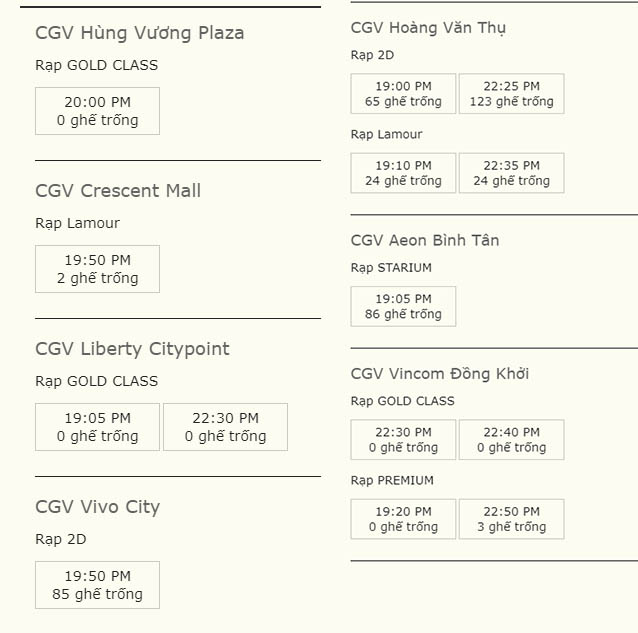 Hệ thống Galaxy vẫn chưa mở bán online, chỉ áp dụng cho mua vé trực tiếp. Với mức giá vé rẻ hơn hai hệ thống của Hàn Quốc ở trên, chuỗi rạp phim Việt có vẻ cũng đã cháy vé ở tại các rạp.