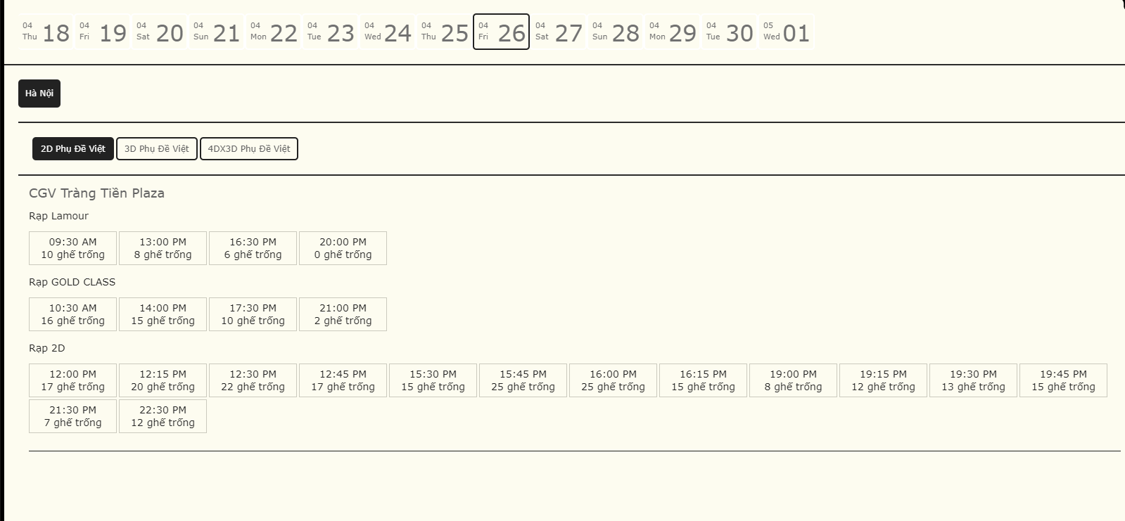 Tình hình đặt vé cho các ngày thứ Sáu 26/04 vẫn chưa tiết lộ được nhiều. CGV chỉ mở cho các cụm ở Hà Nội, trong khi Lotte Cinema lẫn Galaxy chưa mở bán cho những ngày chính thức. Thế nhưng, nếu là một fan cứng của Marvel, hãy túc trực thường xuyên để đặt ngay tấm vé xem phim nhé, trước khi kỳ nghỉ lễ 30/04 bắt đầu, vì đây sẽ là dịp khán giả toàn quốc ra rạp xem phim đông hơn bình thường gấp 2-4 lần.
