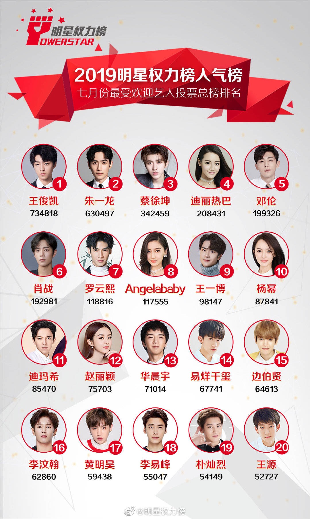 Ngày 01/08 vừa qua, Powerstar ở Weibo đã công bố kết quả bỏ phiếu từ cộng đồng người hâm mộ, cư dân mạng trực tuyến cho hạng mục Ngôi sao quyền lực nhất được yêu mến nhất tháng 7 năm 2019. Được biết, kết quả xếp hạng dựa vào tổng số phiếu bầu từ cư dân mạng dành cho nghệ sĩ mình yêu mến nhất ở nhiều quốc gia trong khu vực châu Á.