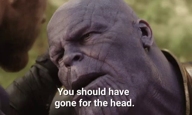 Câu nói của Thanos: “You should have gone for the head” có lẽ là một trong những điểm cao trào nhất của Infinity War, khi gã Titan Điên chưa chết sau cú bổ rìu của Thor và kịp thời thực hiện cú búng tay làm bay màu một nửa số cư dân trong vũ trụ. Trong cuộc đột kích của Avengers trong Endgame, Thor đã “rút kinh nghiệm” và chặt phăng đầu của Thanos.