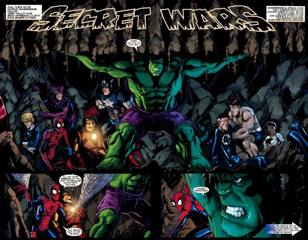 Chi tiết này gợi nhắc đến sự kiện Secret Wars đầu tiên của Marvel, khi những siêu anh hùng của Avengers và Fantastic Four bị Molecule Man thả một ngọn núi nặng đến 150 tỷ tấn lên đầu họ, và Hulk chính là người đã nâng cả ngọn núi cho đến khi Mr. Fantastic tìm ra cách giải cứu cho họ.