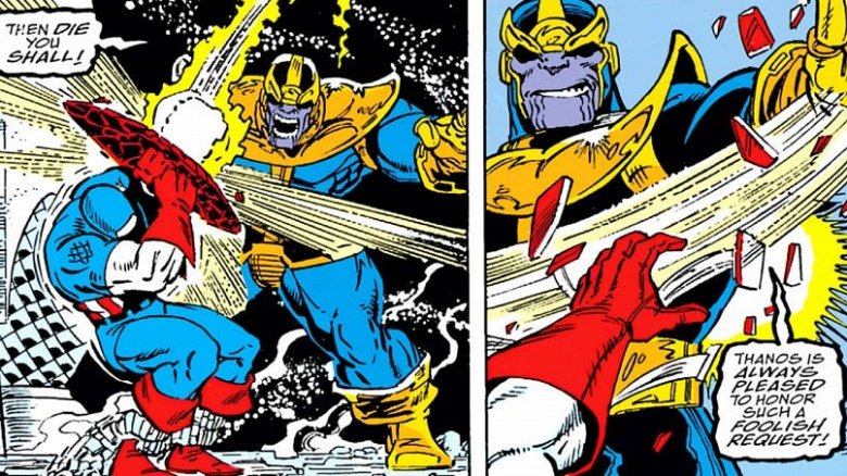 Giống như phiên bản comics, Thanos của MCU cũng đập vỡ khiên Cap.
