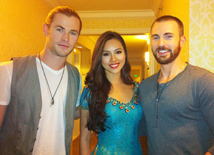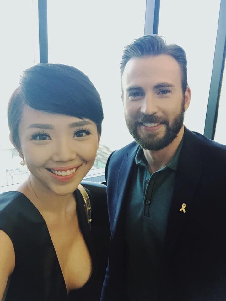 Ngoại hình quyến rũ và sự tự tin của Tóc Tiên đã tạo ấn tượng tốt với dàn sao Avengers: Ages of Ultron, đặc biệt là Chris Evans. Cả hai có cuộc trò chuyện thú vị và cùng lưu lại khoảnh khắc bằng các tấm hình selfie. Bên cạnh đó, đạo diễn Joss Whedon và Mark Ruffalo dành lời khen có cánh cho nữ ca sĩ đến từ Việt Nam.