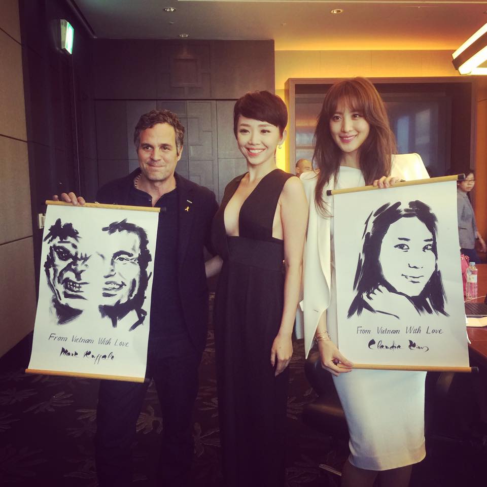 Cô trao tay Mark Ruffalo và Claudia Kim món quà từ người hâm mộ Việt.